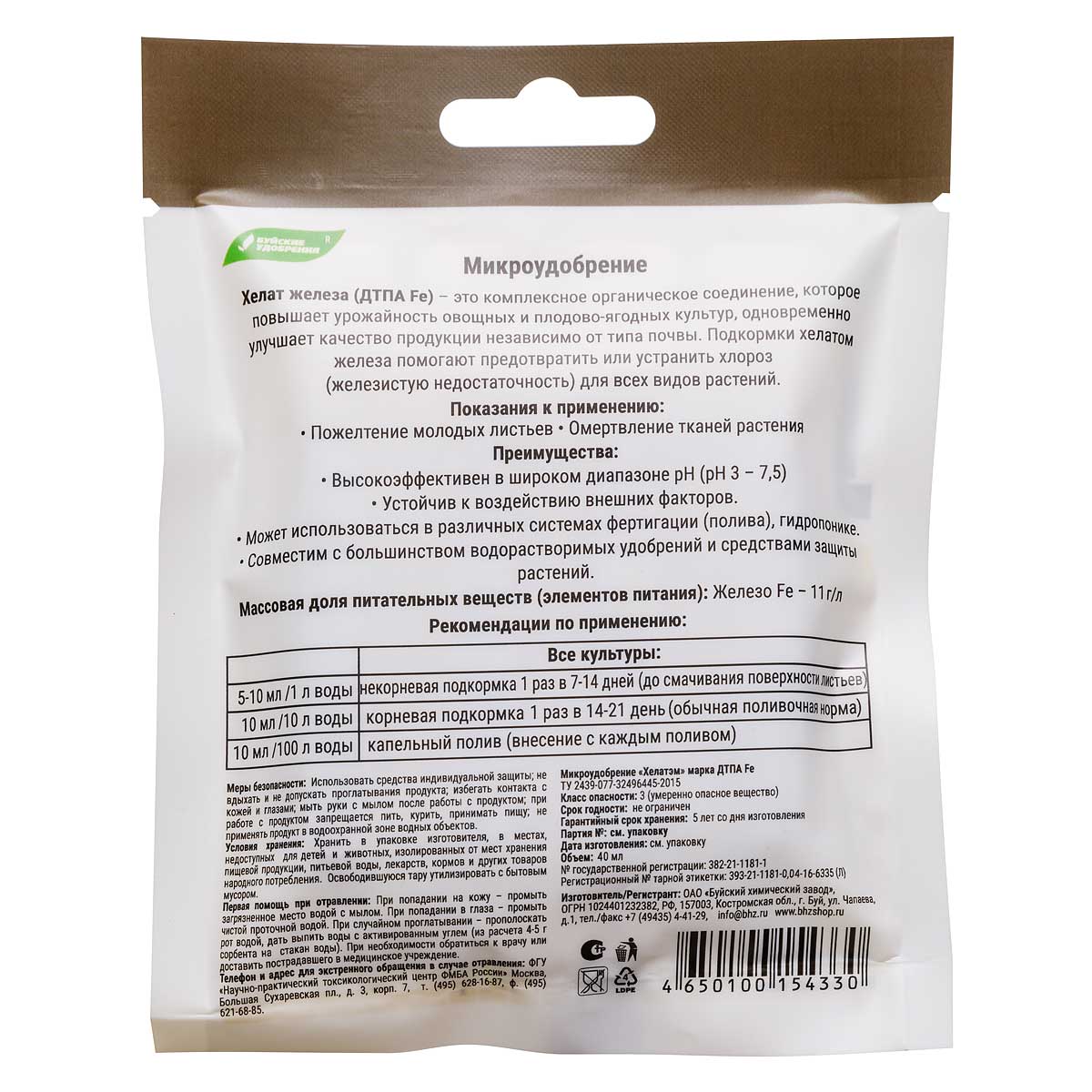 Хелат железа (ДТПА Fe) – это комплексное органическое соединение, которое повышает урожайность овощных и плодово-ягодных культур, одновременно улучшает качество продукции независимо от типа почвы. Подкормки хелатом железа помогают предотвратить или устранить хлороз (железистую недостаточность) для всех видов растений.