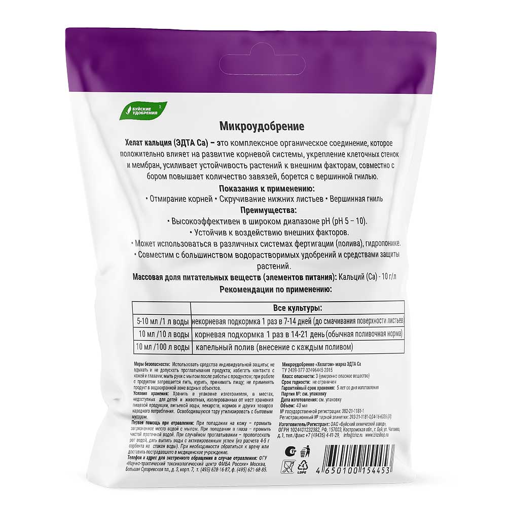 Назначение: Хелат кальция (ЭДТА Cа) – это комплексное органическое соединение, которое положительно влияет на развитие корневой системы, укрепление клеточных стенок и мембран, усиливает устойчивость растений к внешним факторам, совместно в бором повышает количество завязей, борется с вершинной гнилью.