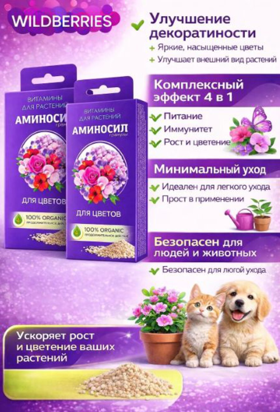 - Улучшение декоративности: способствует яркости и насыщенности цветов, улучшая внешний вид как комнатных, так и садовых растений.